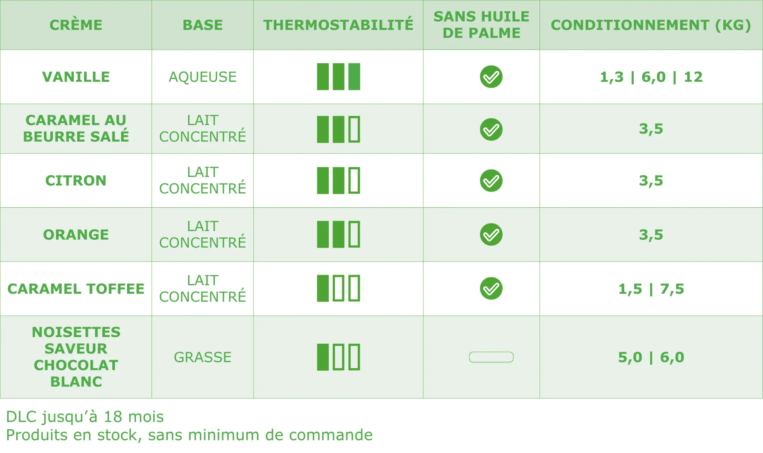 Nos crèmes sont idéales pour réaliser des nappages ou des fourrages, enrichissant vos créations les plus traditionnelles comme les plus audacieuses.