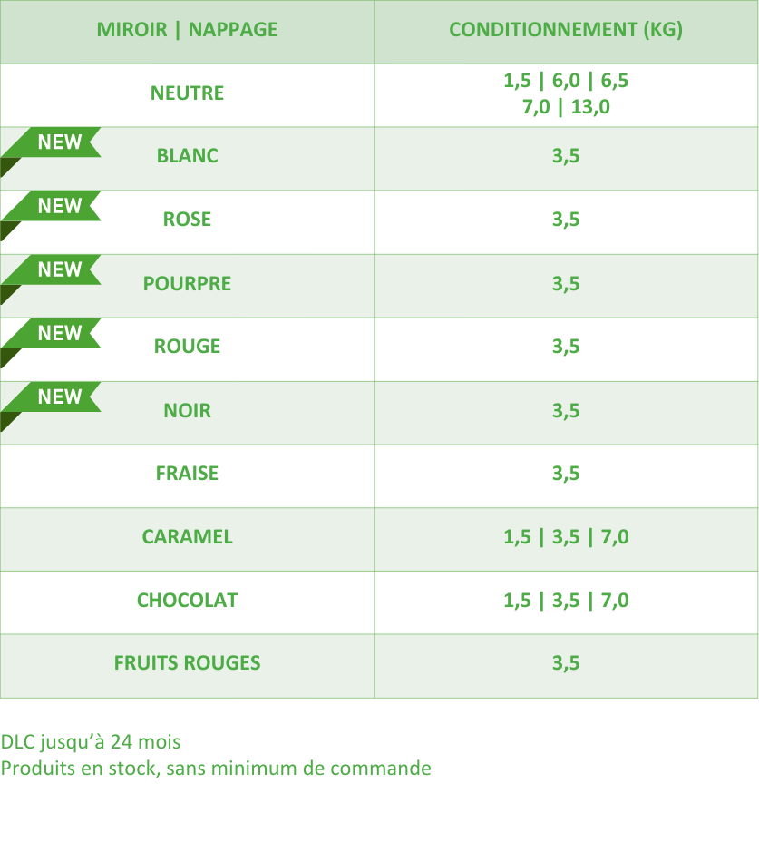 Nous savons que l’apparence d’une pâtisserie est fondamentale, et proposons donc une ample gamme de Miroirs et Nappages pour les usages les plus divers. Les Miroirs et Nappages Decorgel sont faciles à utiliser, stables à l’application, et n’apportent pas seulement la finition parfaite à vos créations : ils contribuent également à leur conservation, en maintenant leurs caractéristiques organoleptiques intactes durant une période plus longue. Toute notre gamme peut être appliquée directement ou à chaud, selon le but recherché.