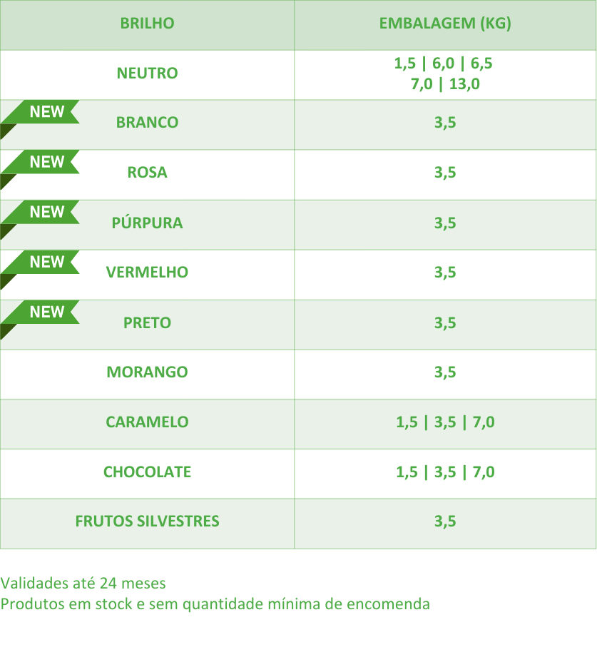 Sabemos que a aparência de um produto de pastelaria é fundamental, pelo que apresentamos uma ampla gama de Brilhos para as mais diversas finalizações. Os Brilhos da Decorgel, fáceis de utilizar e estáveis na aplicação, não só conferem o acabamento perfeito às suas criações, com decorações elegantes, como contribuem para a sua conservação, mantendo as características organoléticas inalteradas por um período superior. Toda a nossa gama pode ser aplicada diretamente ou a quente, conforme a finalidade a que se destinam.