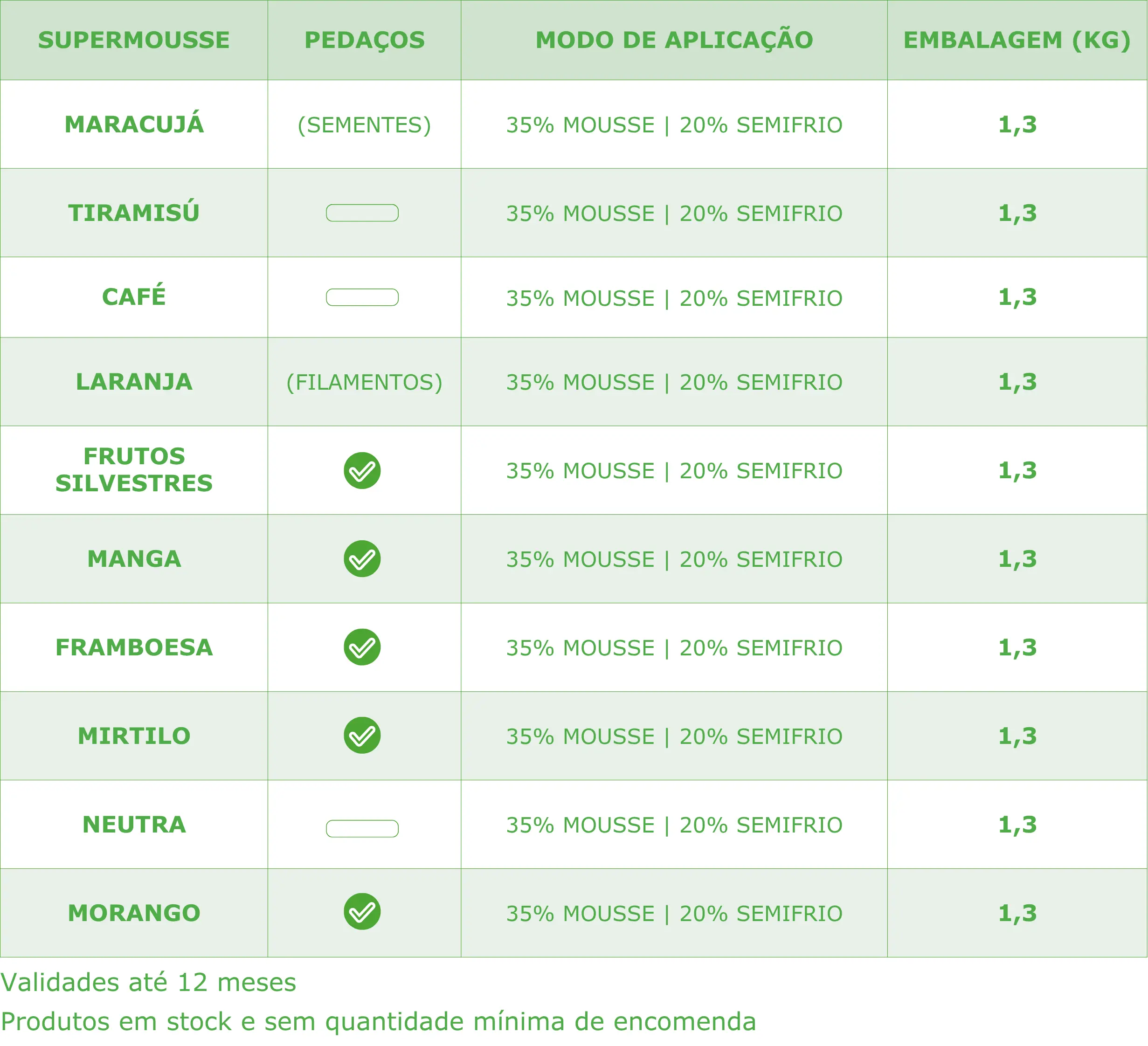Procura um sabor diferente, ou uma Supermousse com ainda mais perceção de fruta? Desenvolvemos Supermousses à sua medida, de forma ágil, requerendo encomendas mínimas de apenas 150kg.